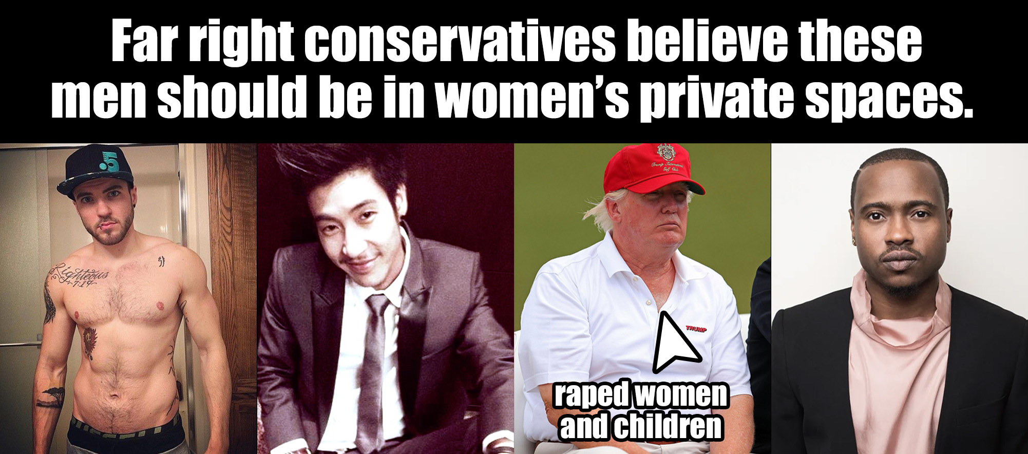 Then there are trans men who have had people threaten them for saying out loud, if you see them walking in or out of a women’s restroom, that’s what they wanted in the first place. Then there is trump who like I mentioned before, has talked about walking in to changing rooms of pageant contestants and watching them. And his transphobic supporters have never complained about that. On top of the fact he’s had numerous credible accusations of rape against women and children, and his supporters still simply don’t care.