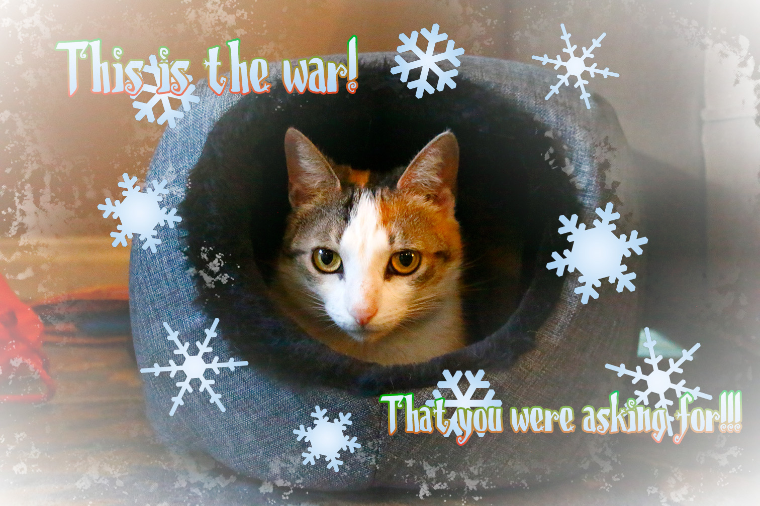 Anyways, what inspired this card has to do with one a friend send out a few years ago with her new dog. It was a photo of him and it said, Peace on Earth. I wanted to dome own silly version and asked myself, what is the opposite of Peace on Earth, but takes from a song. I was thinking from taking from a Kreator song, Slayer, then came across one from the band Vader, and I thought it worked perfectly, then added the calico and all came just right. With some quick and cheap effects because I was feeing lazy.