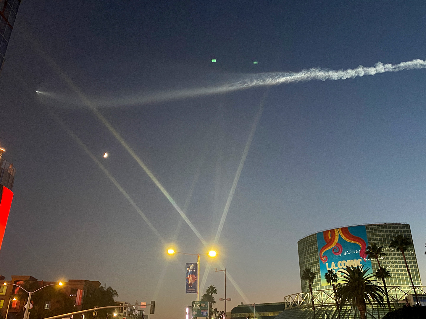 After LA Comic Con had ended Sunday, I was walking around and talked to some friends who were still there. Some people were eating, others just making videos and getting their last looks. While talking to a few people one guy noticed this rocket going by coming from what I’m guessing was from Vandenberg. Because of the street lights in downtown there was some glare on the screen, and one guy wasn’t happy with how his photo came out. I showed him this and asked how I got some of the glare out. So I showed him, and all you have to do is hover your hand over the lens, just out of the frame and cuts of it out. Much like what the lens hood does with my camera.